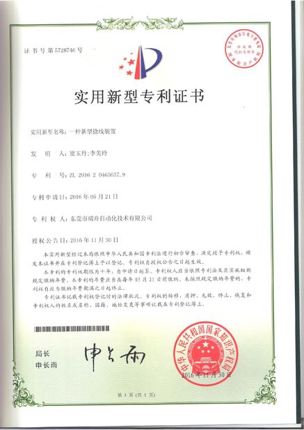 Standard:Letters Patent (Twisting Device) Number:ZL 2016 2 0463637.9 Issue Date:2016-11-30 Issued By:Intellectual Property Office of the People's Republic of China |