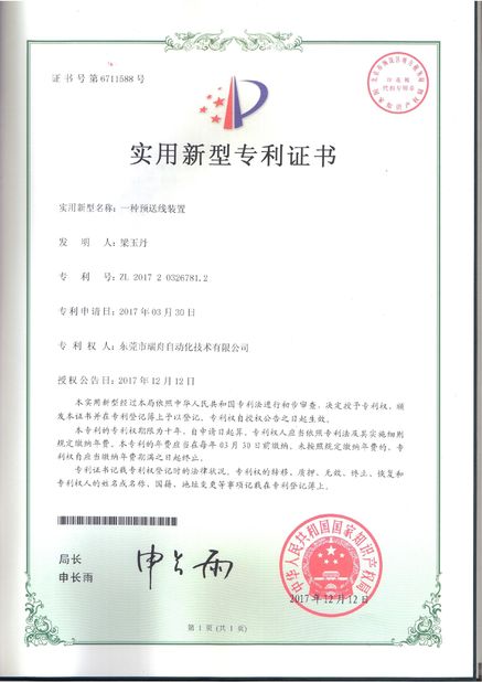 Standard:Letters Patent (Pre-feeding Device) Number:ZL 2017 2 0326781.2 Issue Date:2017-12-12 Issued By:Intellectual Property Office of the People's Republic of China |